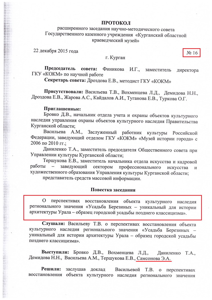 Считаю, что и постановка вопроса о перспективах восстановления Усадьбы купцов Березиных на этом собрании довольно сомнительная, нелегитимная попытка Управления культуры Курганской области и Курганского областного краеведческого музея, даже невзирая на принятое решение, затянуть процесс принятия ответственных решений и необходимых действий. Возникает вполне логичный вопрос, а почему перспективы восстановления Усадьбы не стали обсуждать на методическом совете дворников или собрании трудового коллектива ОАО "Курганский машиностроительный завод" ("Курганмашзавод"), решения этих собраний, даже с приглашением специалистов были бы не менее значимы?