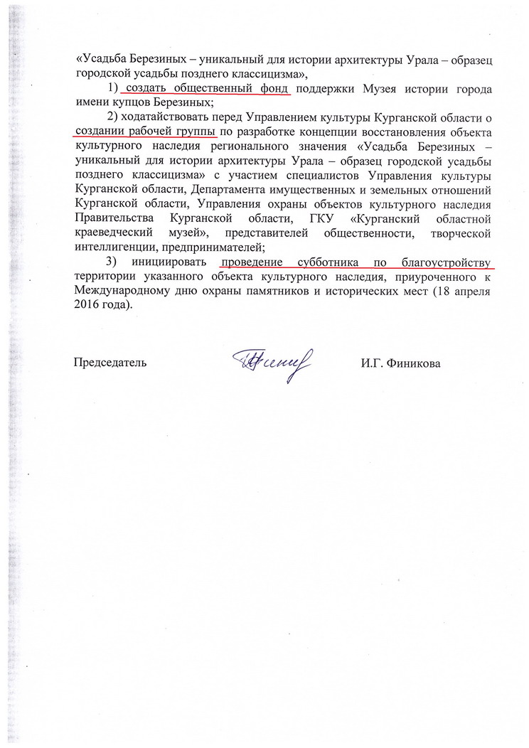 2) О решении: решение совета поддерживает обеспокоенность общественности и властей Курганской области, что Усадьба купцов Березиных может быть утрачена. С целью недопущения утраты, как становится ясно из Протокола, поддержаны основные положения выступления Татьяны Васильевой, а именно - необходимость привлечения внебюджетных средств для восстановления Усадьбы (создание фонда), продолжение разработки концепции использования этого объекта культурного наследия (ходатайство о создании рабочей группы), проведение субботника...