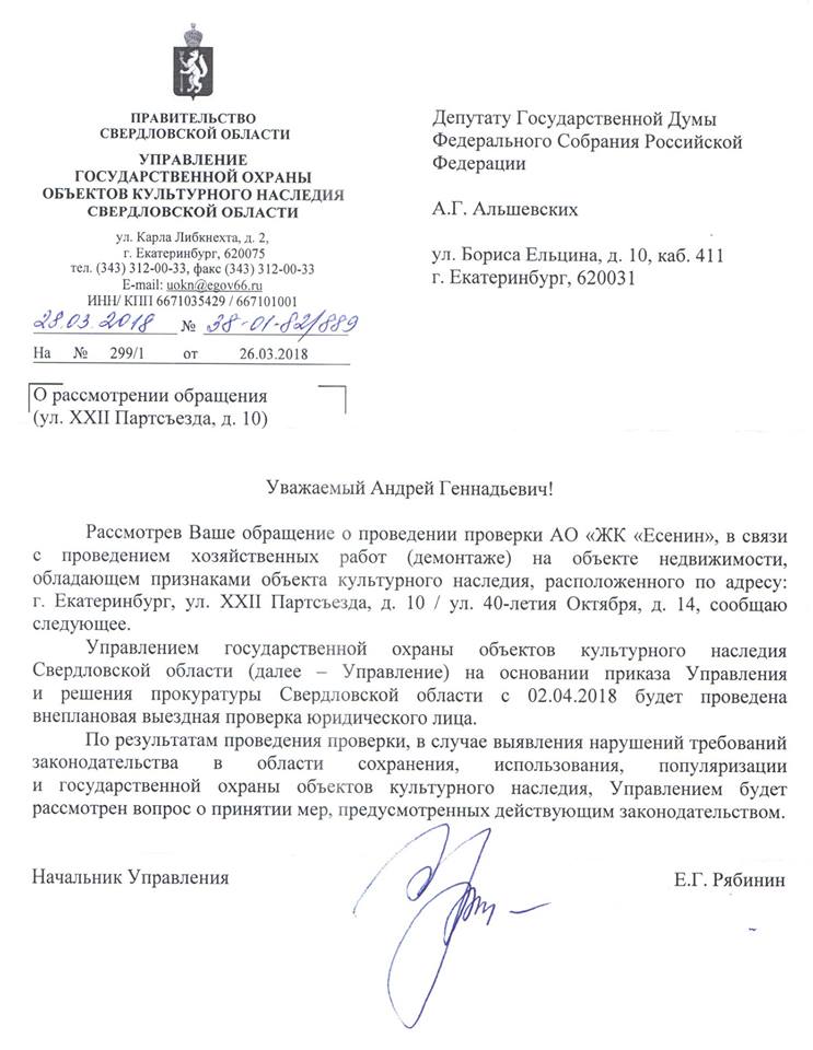 Управление госохраны объектов культурного наследия Свердловской области проверит законность действий АО ЖК «Есенин», которое снесло здание кинотеатра «Темп» на Уралмаше, об этом в соцсетях сообщил депутат Госдумы РФ Андрей Альшевских.