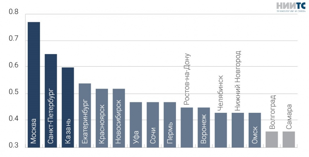 Пятерка самых умных городов выглядит следующим образом: Москва, Санкт-Петербург, Казань, Екатеринбург, Красноярск. При этом отмечается, что в Екатеринбурге и Казани технологии заметно развиваются относительно возможностей бюджета.