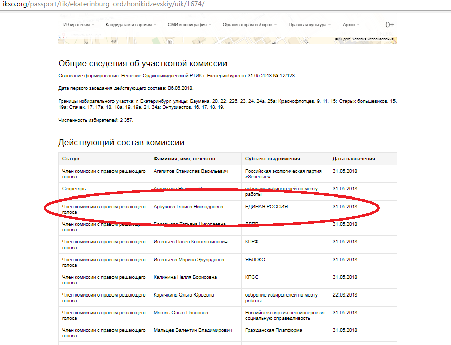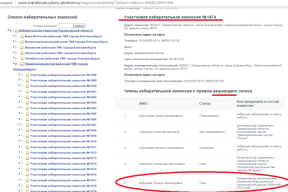 Сегодня «Единая Россия» распределила мандаты, полученные при голосовании за партийные списки. Информация была озвучена лидером свердловских единороссов Виктором Шептием на пресс-конференции. Один из шести мандатов достался лидеру округа № 15 Галине Арбузовой, которая является директором МАОУ СОШ № 67. Однако редакция «Вечерних ведомостей» выяснила, что Галина Арбузова указана как член участковой избирательной комиссии с правом решающего голоса в своем же 15-м округе, да еще в УИК № 1674 — в школе, директором которой Арбузова и является. Информация об этом опубликована здесь и здесь.