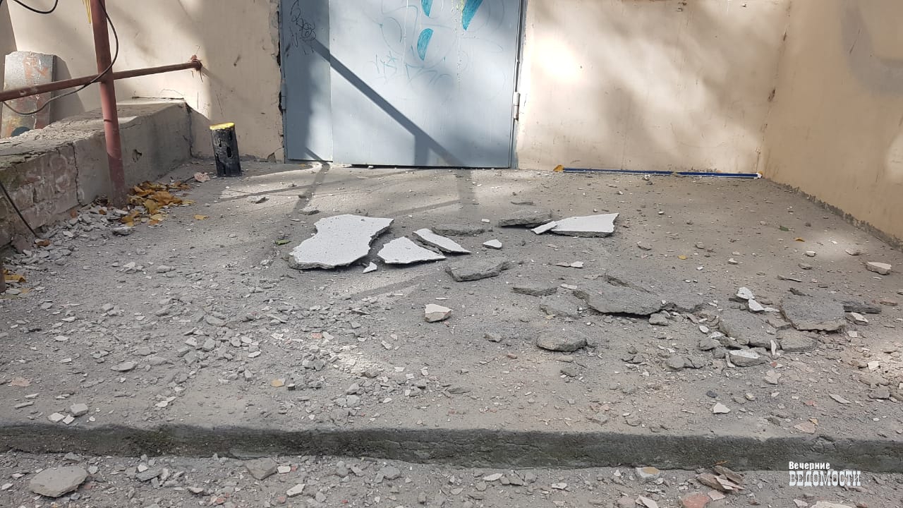 Размеры отпавших кусков облицовки немалые, их падение сопровождается достаточно громким звуком. Судя по размерам кусков штукатурки, в случае их падения на человека наверняка будет причинен вред здоровью, при этом сотрясение головного мозга может быть не самым страшным исходом.