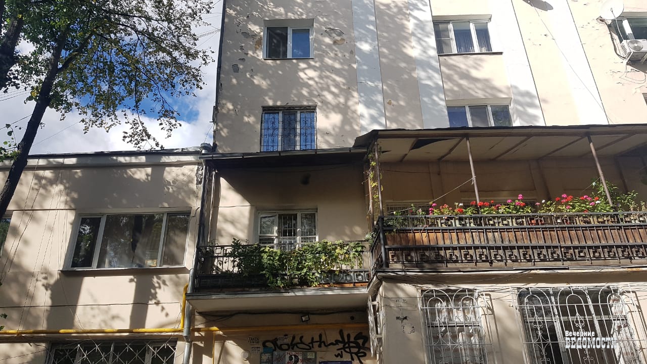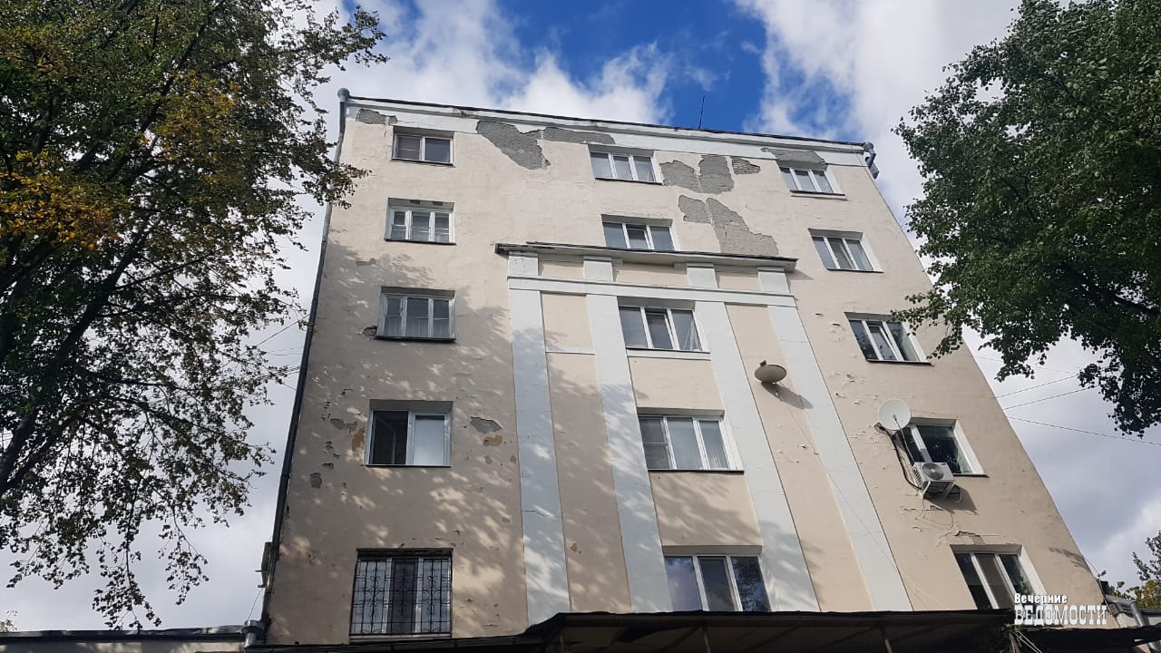 Со стены дома в центре Екатеринбурга на головы людей падают куски штукатурки