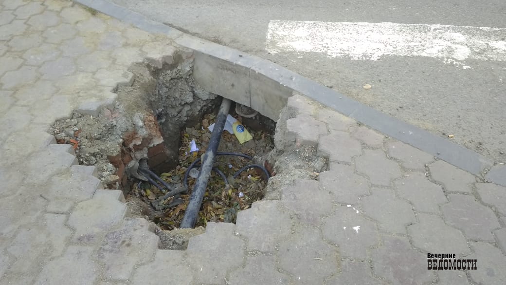 В яме — мусор и провода. Остается только надеяться, что в случае падения в яму с человеком не случится ничего страшного.
