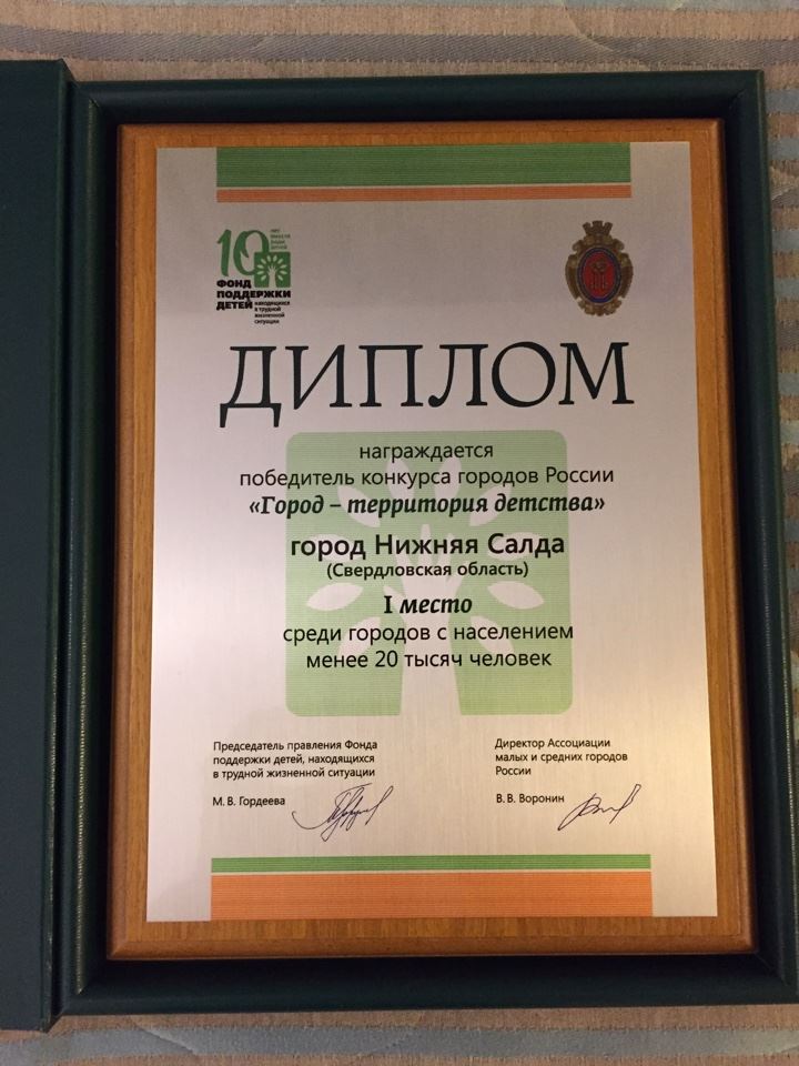 Нижняя Салда заняла первое место в конкурсе «Город – территория детства» среди городов с населением до 20 тысяч человек. Накануне, 17 декабря, в Совете Федерации состоялась торжественная церемония награждения.