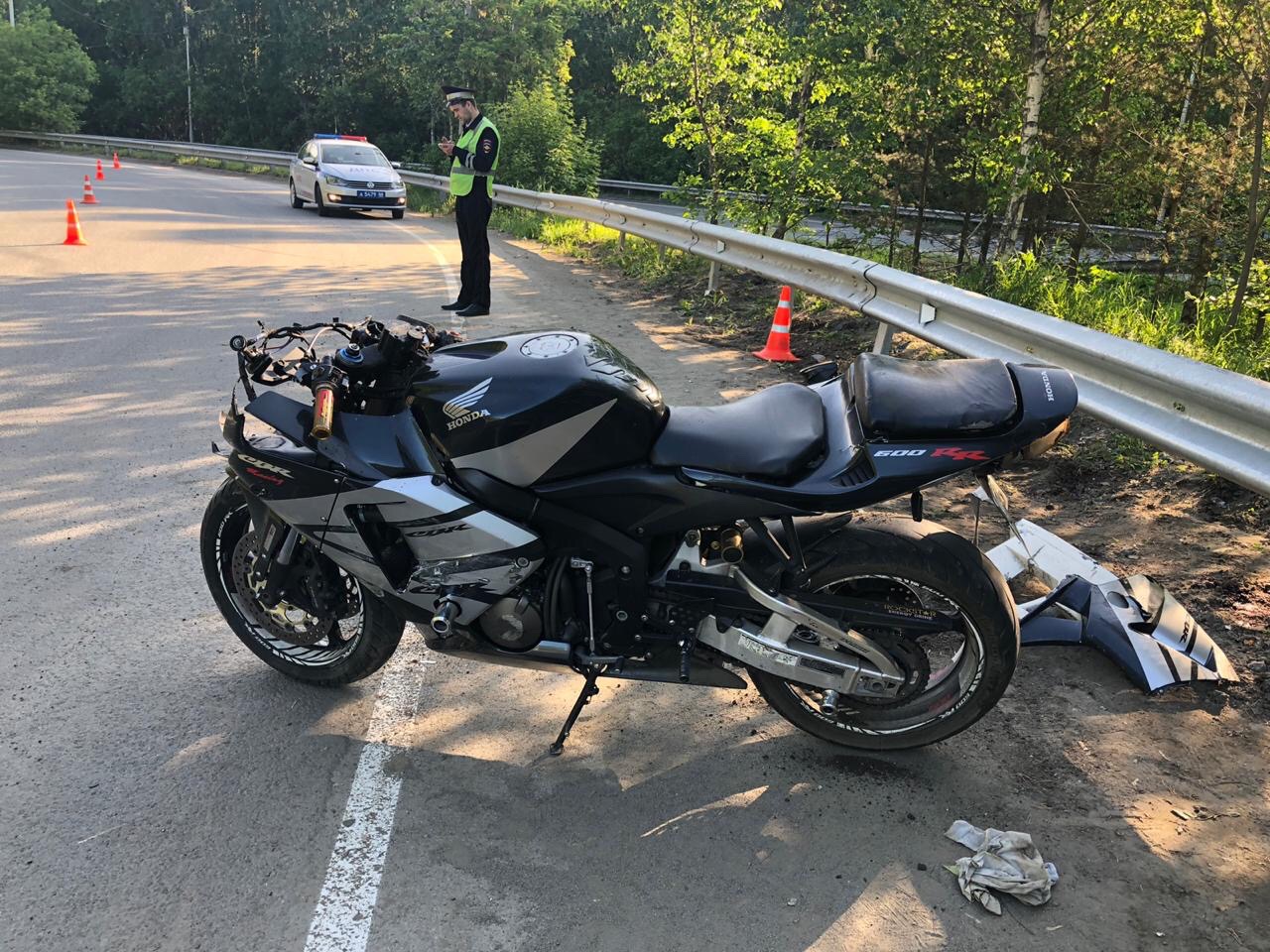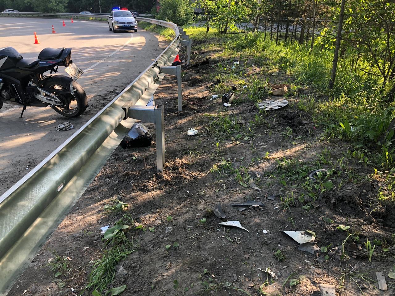 В результате аварии передняя часть мотоцикла получила повреждения. Шлем водителя переломился.