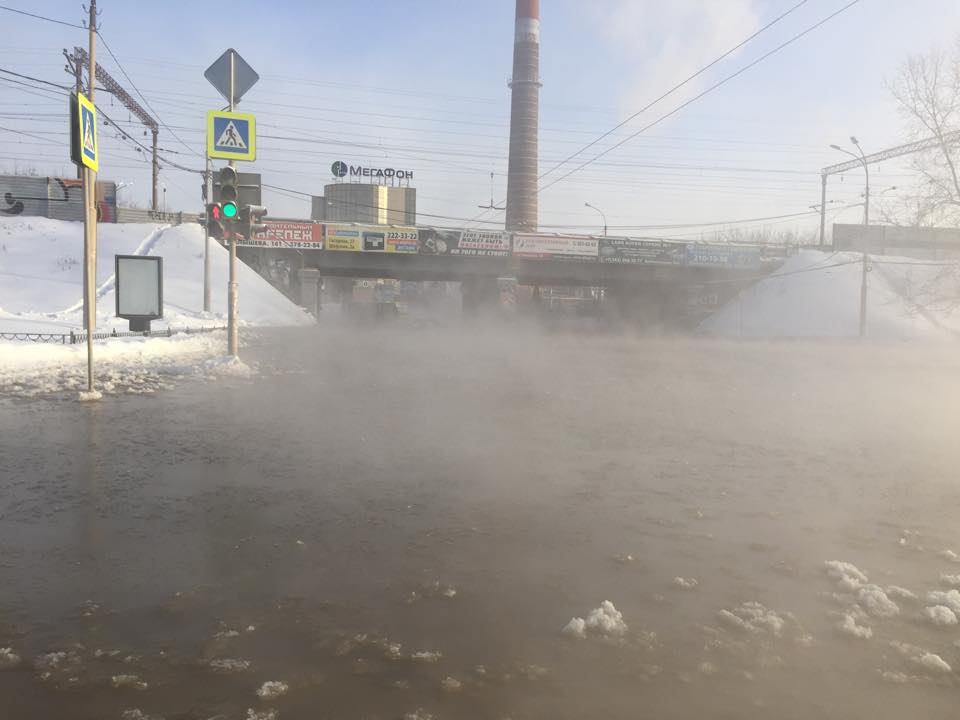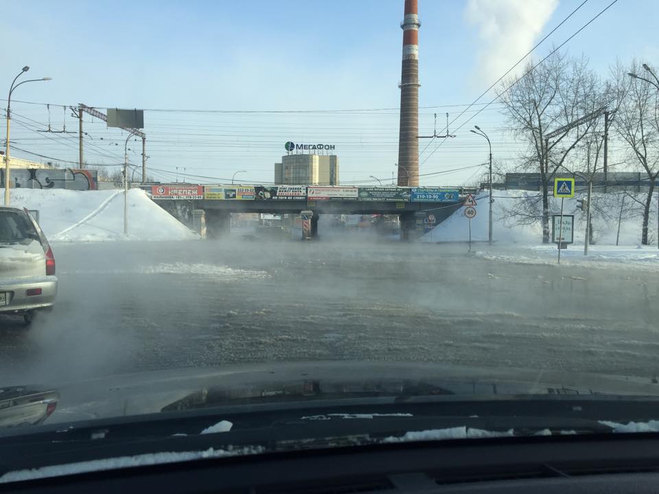 Как сообщают очевидцы, в ледяном плену оказались несколько автотранспортных средств, в том числе автобус маршрута 077. В настоящее время на месте прорыва дежурят сотрудники ГИБДД, дорожные службы проводят расчистку дорожного полотна.