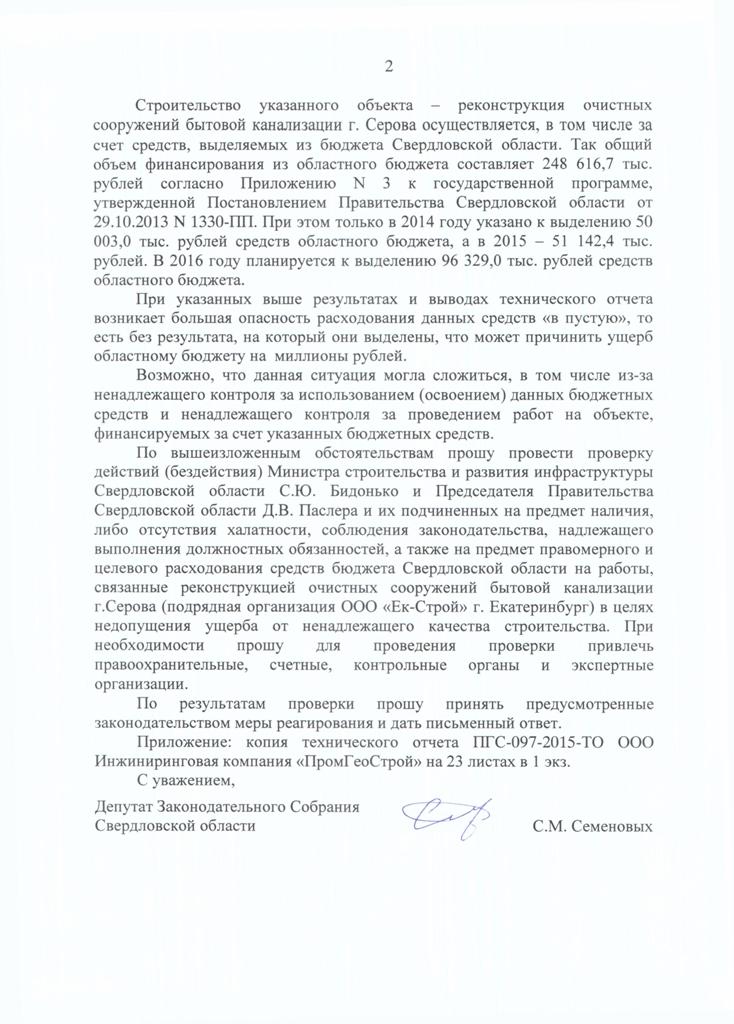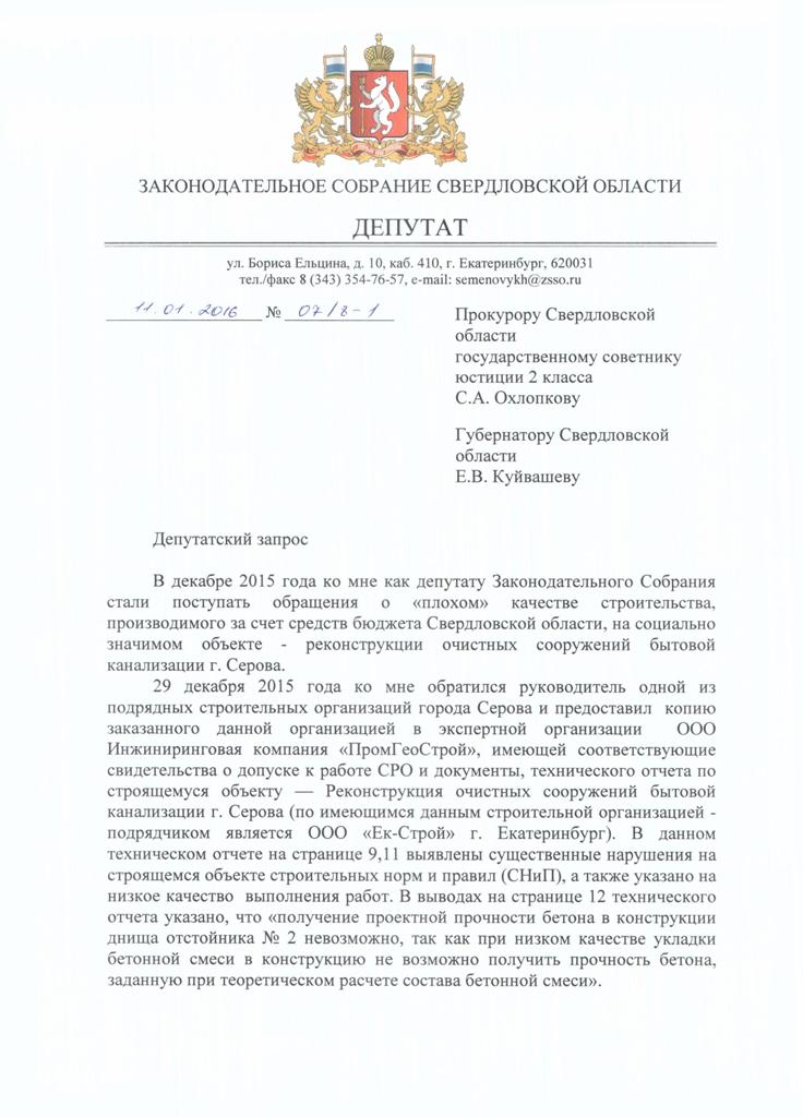 «Возможно, данная ситуация могла сложиться в том числе из-за ненадлежащего контроля за использованием (освоением) бюджетных средств и ненадлежащего контроля за проведением работ на объекте, финансируемых за счет средств областного бюджета», – пишет в запросе прокурору и главе региона Сергей Семеновых.