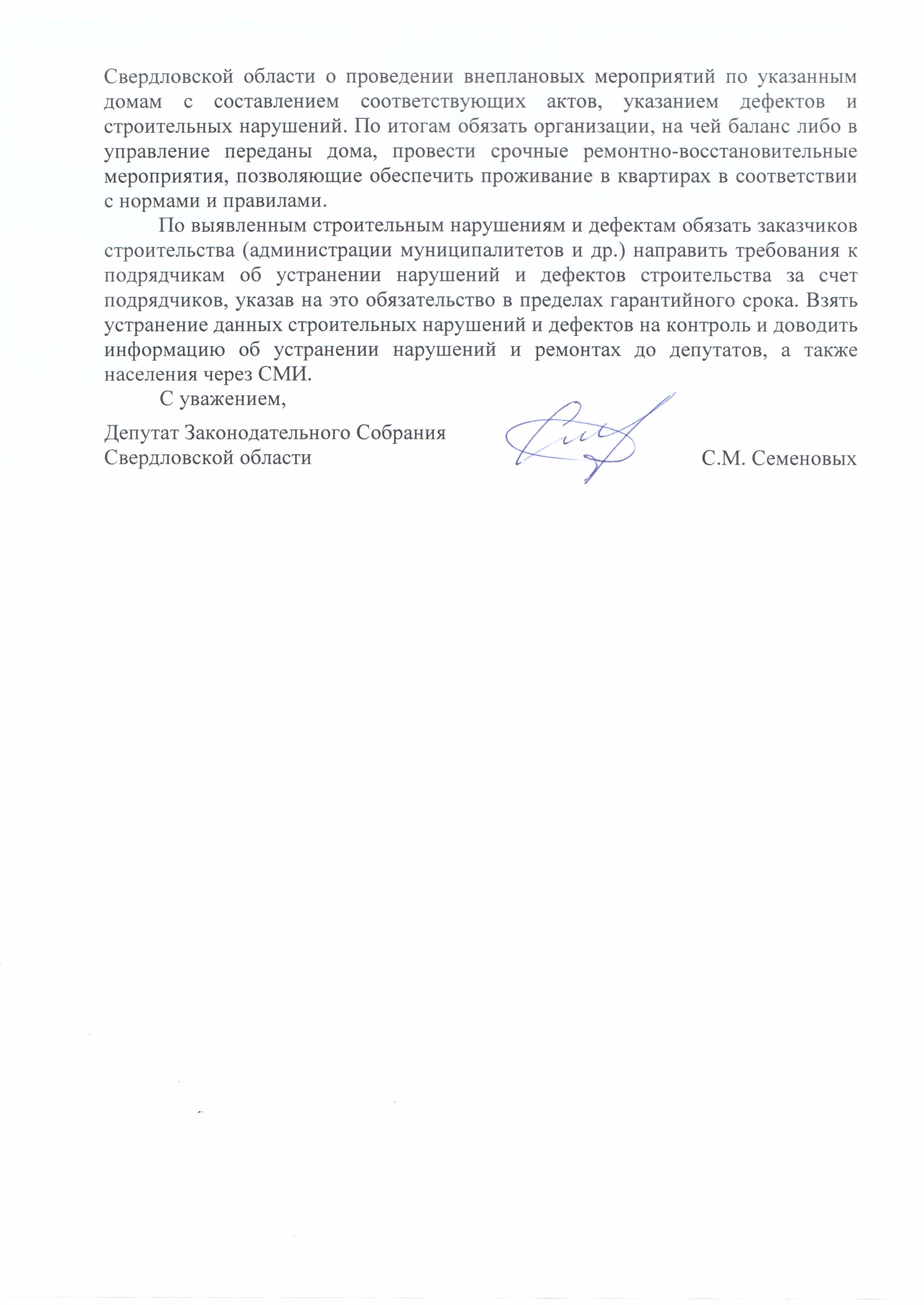 Парламентарий отмечает, что данные дома не проходили государственную экспертизу проекта, за ними не осуществляется государственный строительный надзор и контроль. Сергей Семеновых просит дать «жесткие» поручения подразделениям жилищного контроля Департамента государственного жилищного и строительного надзора, чтобы они провели внеплановые проверки указанных домов, выявив дефекты и строительные нарушения. По итогам проверочных мероприятий необходимо обязать организации, на чей баланс переданы дома, провести срочные ремонтные работы.