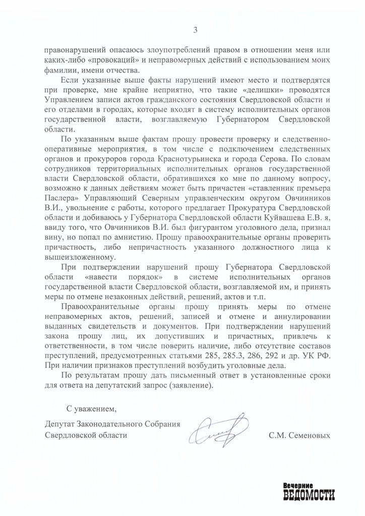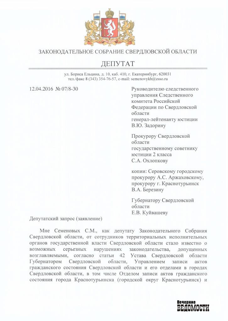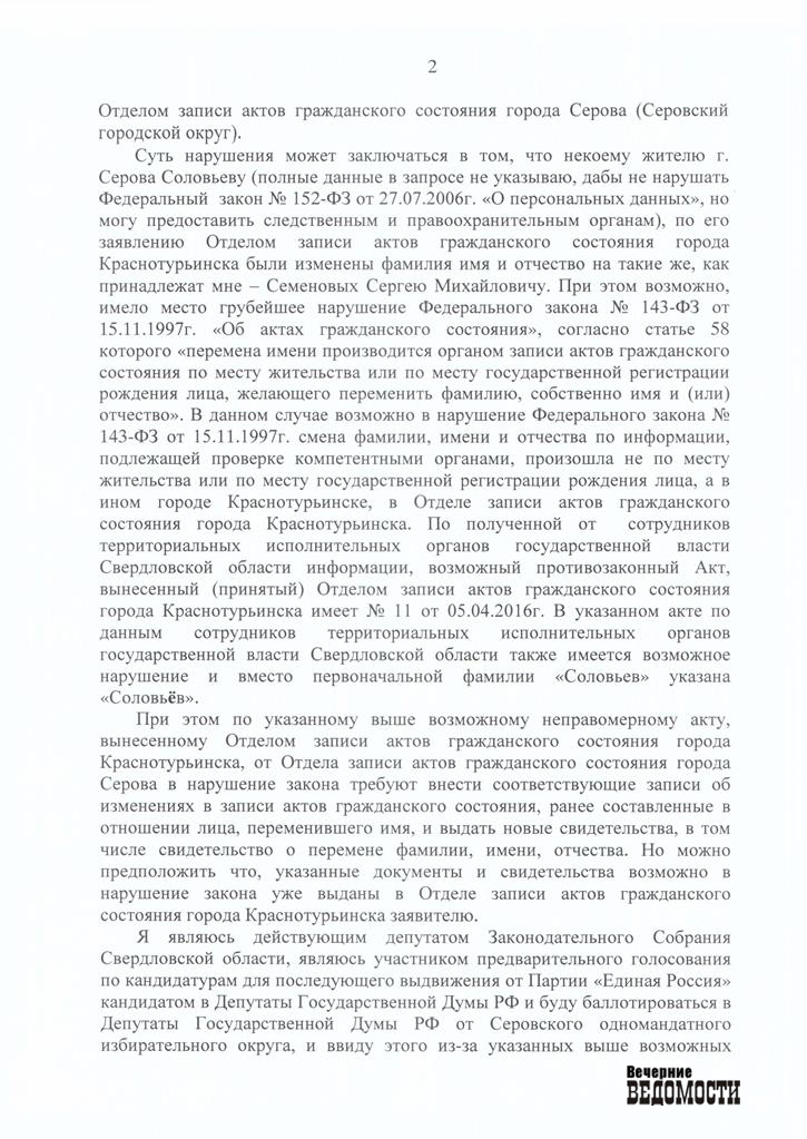 По словам депутата Заксобрания Сергея Семеновых, о появлении полного тезки ему сообщили сотрудники территориальных исполнительных органов госвласти. Парламентарий считает, что данный факт, возможно, серьезное нарушение законодательства. Поэтому с просьбой провести проверку он обратился к руководителю Следственного управления СКР по Свердловской области Валерию Задорину, региональному прокурору Сергею Охлопкову и губернатору Евгению Куйвашеву.