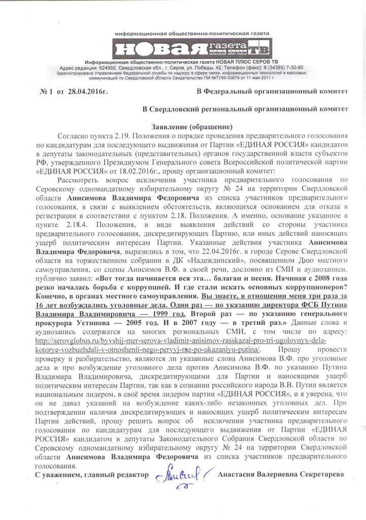 За данное высказывание исключить Владимира Анисимова из числа участников праймериз просит главный редактор информационной общественно-политической газеты «Новая плюс Серов ТВ» Анастасия Секретарева.