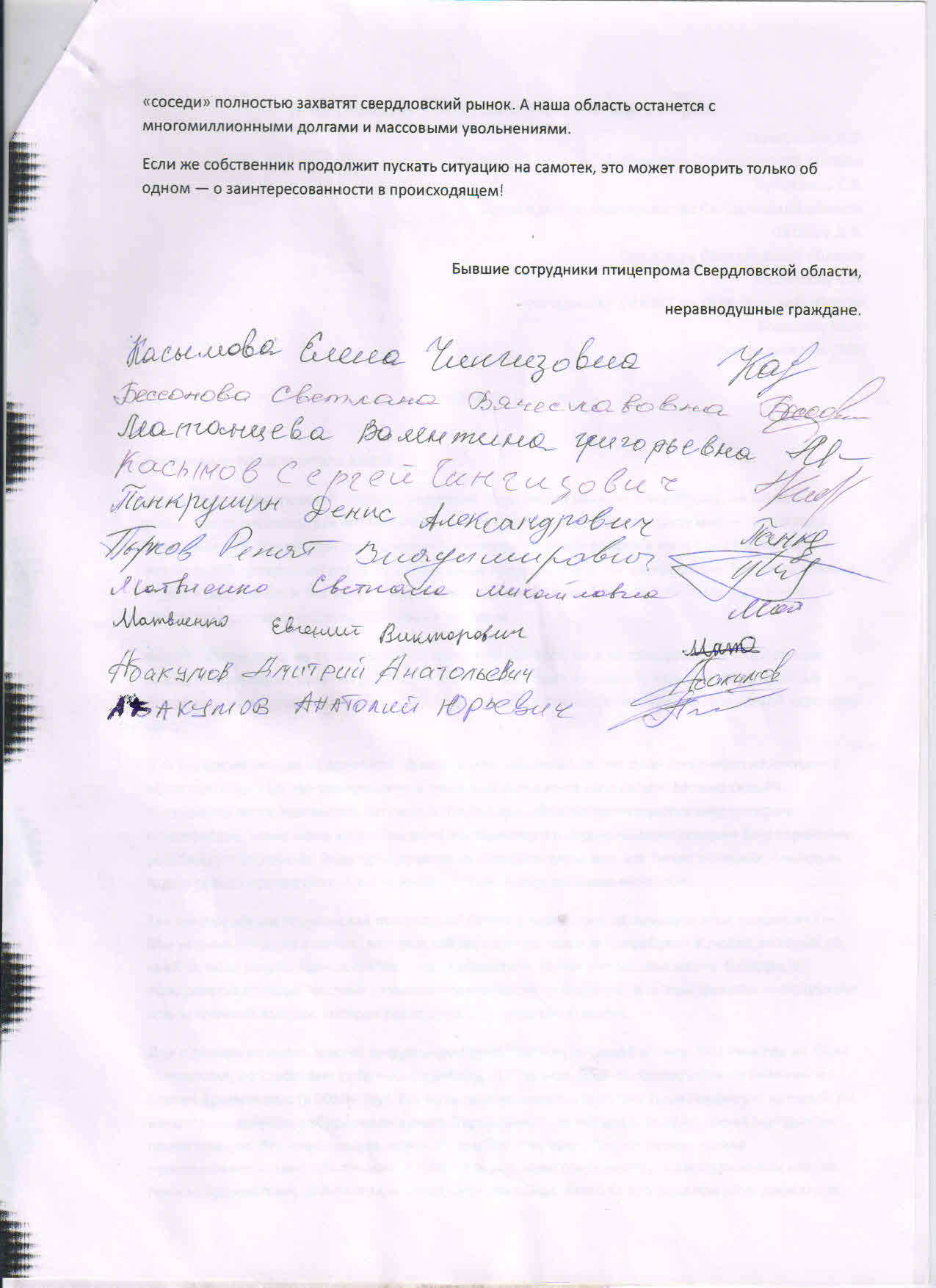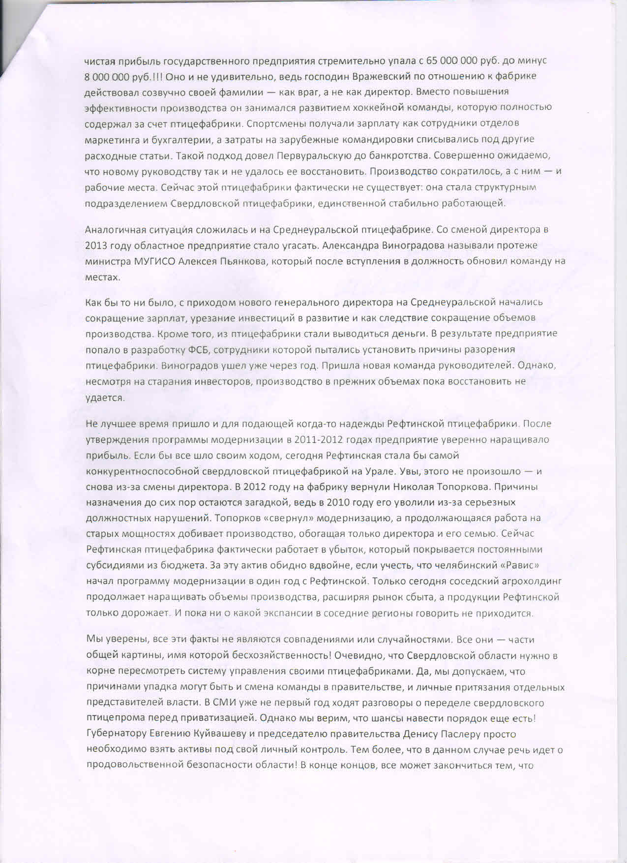 «С приходом нового генерального директора на Среднеуральской начались сокращение зарплат, урезание инвестиций в развитие и как следствие сокращение объемов производства. Кроме того, из птицефабрики стали выводиться деньги. В результате предприятие попало в разработку ФСБ, сотрудники которой пытались установить причины разорения птицефабрики», – сообщают авторы письма.