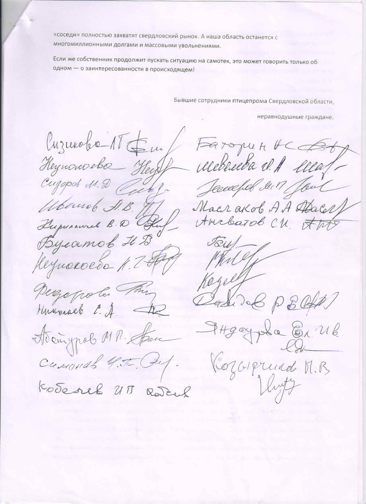 «Да, мы допускаем, что причинами упадка могут быть и смена команды в правительстве, и личные притязания отдельных представителей власти. В СМИ уже не первый год ходят разговоры о переделе свердловского птицепрома перед приватизацией. Однако мы верим, что шансы навести порядок еще есть! Губернатору Евгению Куйвашеву и председателю правительства Денису Паслеру просто необходимо взять активы под свой личный контроль. Тем более, что в данном случае речь идет о продовольственной безопасности области! В конце концов, все может закончиться тем, что «соседи» полностью захватят свердловский рынок. А наша область останется с многомиллионными долгами и массовыми увольнениями. Если же собственник продолжит пускать ситуацию на самотек, это может говорить только об одном – о заинтересованности в происходящем!» – сказано в письме бывших сотрудников птицепрома Свердловской области, которые поставили несколько десятков подписей под данным обращением.