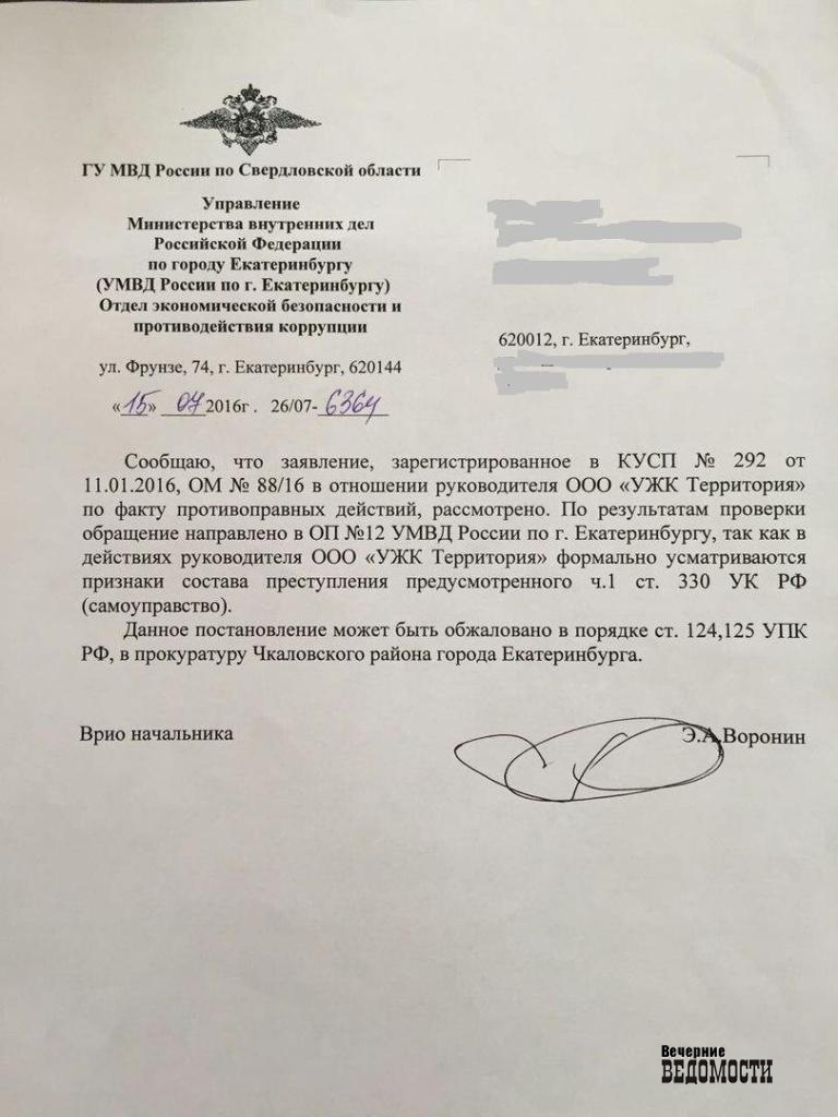«По результатам проверки обращение направлено в ОП № 12 УМВД России по г. Екатеринбургу, так как в действиях руководителя ООО «УЖК «Территория» формально усматриваются признаки состава преступления, предусмотренного ч. 1 ст. 330 УК РФ (самоуправство)», – значится в ответе силовиков за подписью врио начальника городского ОЭБиПК Эдуарда Воронина.