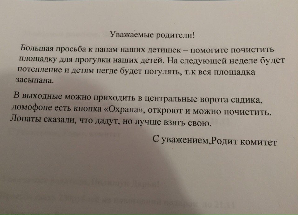 Отметим также, что родители жалуются не только на директоров школ, но и на заведующих детскими садиками. Так, в дошкольном учреждении № 454 на улице Походной в Екатеринбурге висит объявление следующего содержания: «Большая просьба к папам наших детишек – помогите очистить площадку для прогулки наших детей. В выходные можно приходить в центральные ворота садика, на домофоне есть кнопка «Охрана», откроют и можно почистить. Лопаты сказали, что дадут, но лучше взять свою».