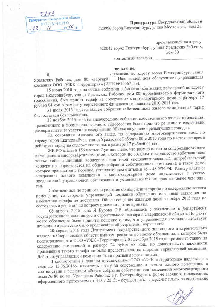 Еще в июле 2013 года на общем собрании собственников дома они установили тариф в размере 17,04 руб. за кв. м. Не изменился он и в ноябре 2015 года, когда собственники провели очередное голосование. Только вот спустя несколько дней коммунальщики в лице ООО «УЖК «Территория», прикрываясь постановлением Администрации города Екатеринбурга и не спрашивая мнения жильцов, повысили ставку более чем на 7 рублей.