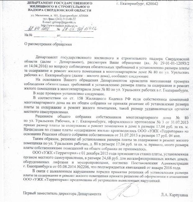 Сотрудники Департамента государственного жилищного и строительного надзора (ГЖИСН), выявив нарушения жилищного законодательства, выдали ООО «УЖК «Территория» предписание от 25 апреля 2016 года об их устранении. В соответствии с данным документом, до 15 июня УК Дмитрия Сеня должна была начислять плату по тарифу, утвержденному жителями, – по ставке 17,04 руб., а также сделать перерасчет.