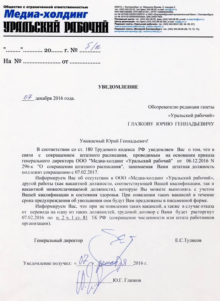 Критические отзывы о строительстве «храма на воде» в Екатеринбурге приводят к потере работы. С этим, возможно, столкнулся обозреватель редакции газеты «Уральский рабочий» Юрий Глазков. Сегодня, 7 декабря, гендиректор медиахолдинга Евгений Тулисов подписал уведомление о том, что должность Юрия Глазкова будет сокращена с 7 февраля.