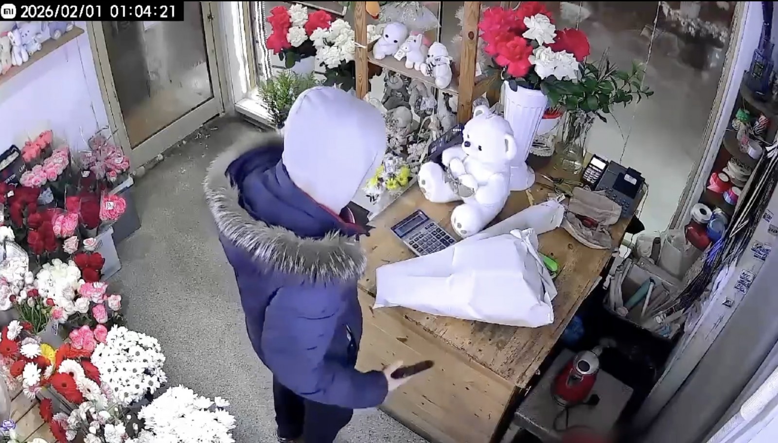 «Прибывшие на место полицейские изъяли записи камер наблюдения и выяснили, что подозреваемый действительно появился в павильоне после полуночи. Он потребовал собрать ему один букет, а потом выбрал ещё один, готовый, и указал на мягкую игрушку. Когда флорист упаковала все покупки, клиент вместо денег достал пистолет и заставил её лечь на пол. После чего, прихватив цветы и медведя, ушёл»,