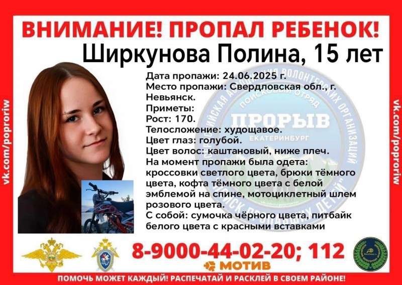 Поисковый отряд «Прорыв» сообщает о пропаже в Невьянске двух несовершеннолетних: 15-летней Полины Ширкуновой и 17-летнего Артёма Масленникова. Со вторника, 24 июня, их местонахождение остаётся неизвестным.