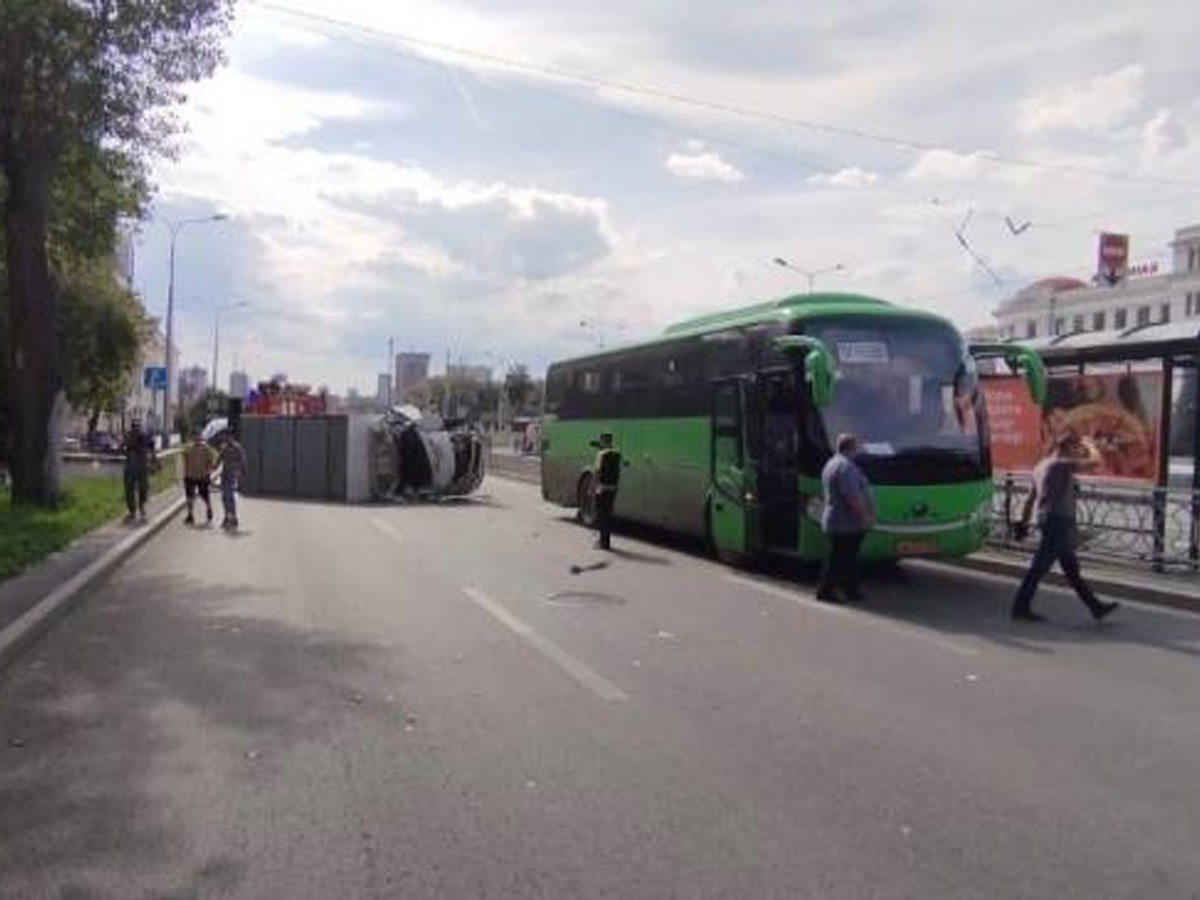 В Екатеринбурге после столкновения с автобусом опрокинулся грузовик