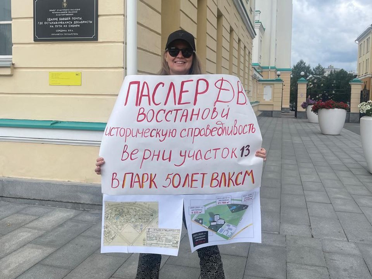 С плакатом, адресованным к временно исполняющему обязанности губернатора Свердловской области Денису Паслеру, вышла местная жительница. Она не хочет, чтобы парк становился меньше.