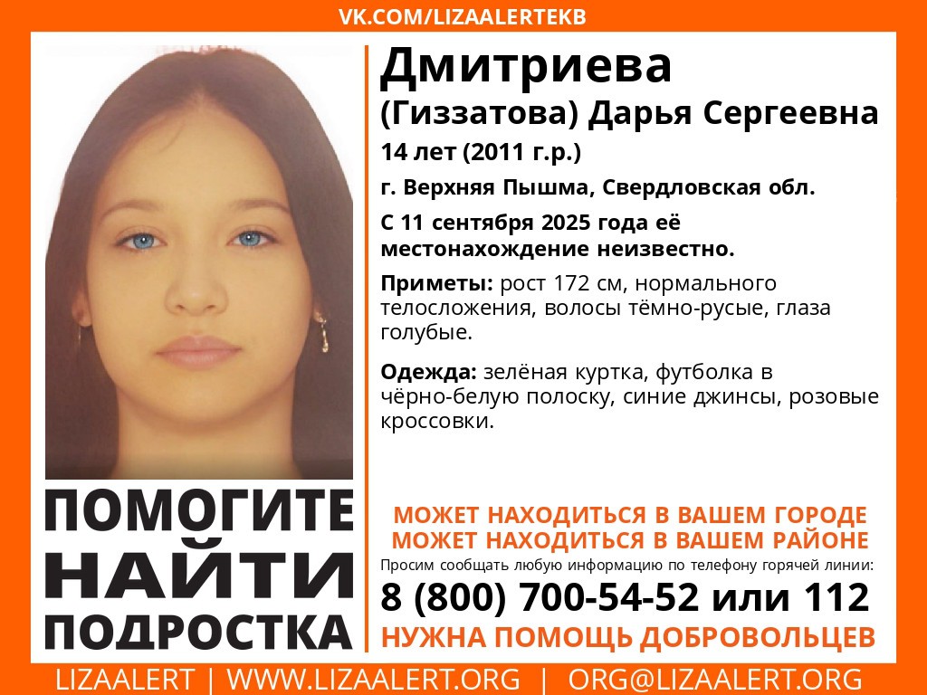 В Верхней Пышме пропала 14-летняя Дарья Дмитриева, сообщает поисковый отряд ЛизаАлерт Свердловской области. По информации отряда, с 11 сентября её местонахождение неизвестно.