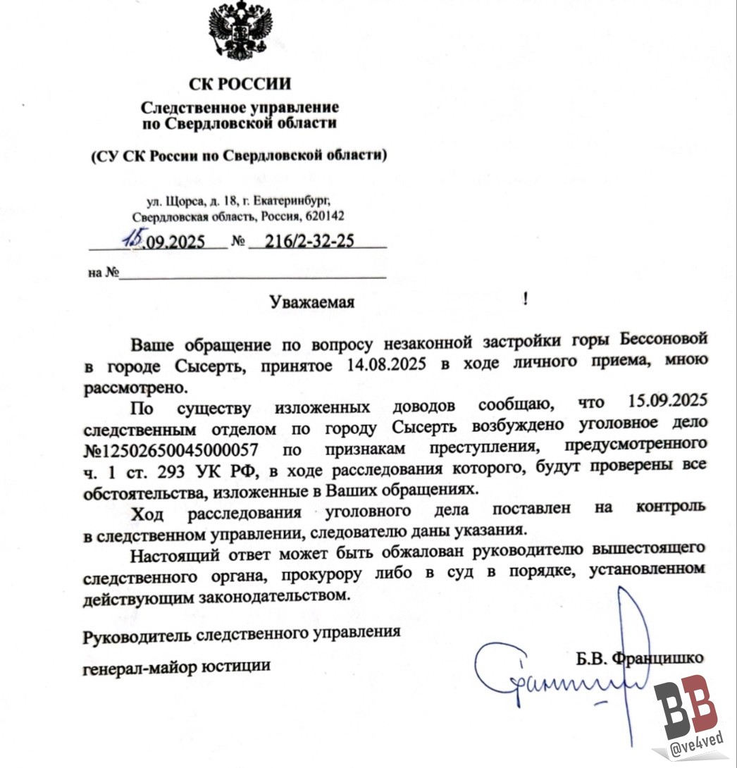Дело сысертчане просили возбудить ещё в 2024 году, но тогда замруководителя следственного отдела по городу Кирилл Воронов отказал в возбуждении дела. Однако в этом году ситуация изменилась — отказное постановление было отменено 15 августа 2025 году новым руководителем областного управления СКР Богданом Францишко.