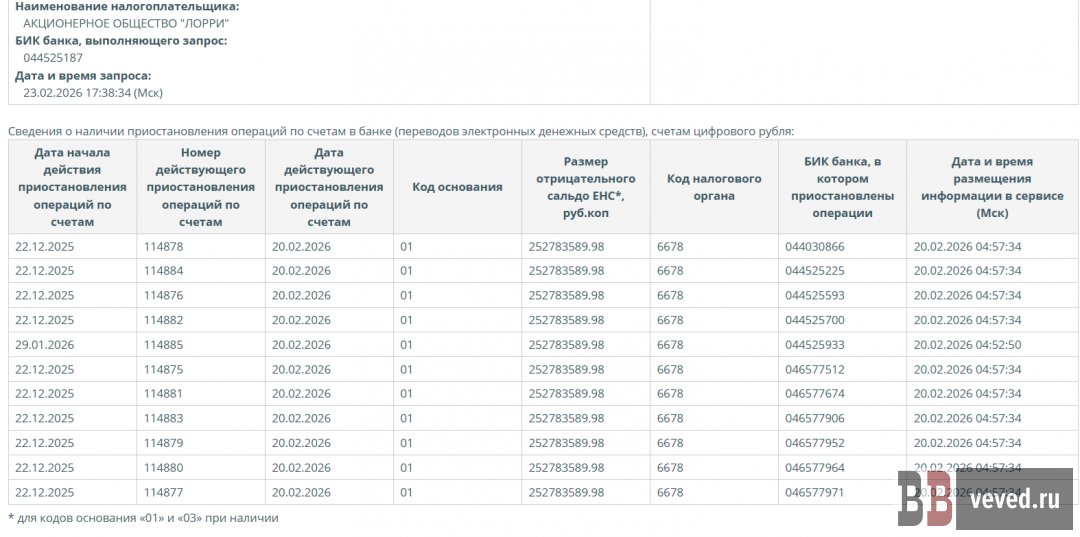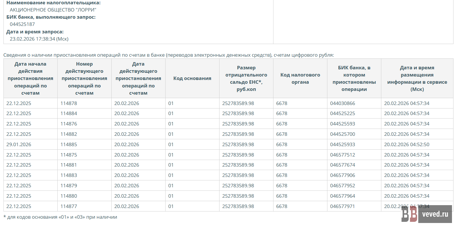 Согласно информации на сайте ФНС, в конце 2025 года были заблокированы счета «Лорри» в 11 банках. Сумма блокировки — 252 миллиона 784 тысячи рублей.