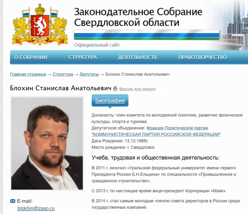 Страница депутата Блохина на сайте Заксобрания Свердловской области
