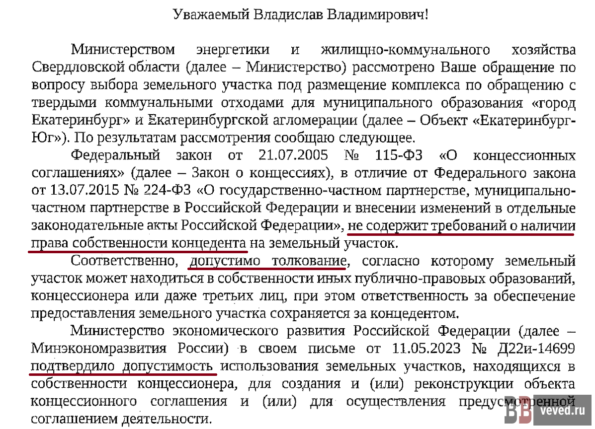 Вечерние ведомости сделали запрос в областное МинЖКХ с вопросом о том, действительно ли областным властям нужно будет ещё и выкупить участок в госсобственность у концессионера «Экологические системы». Вначале министерство указало, что допустимо нахождение участка под мусороперерабатывающим комплексом и полигоном ТКО в частной собственности. И что эту допустимость подтвердило Минэкономразвития РФ: