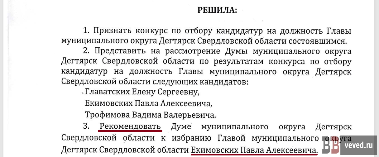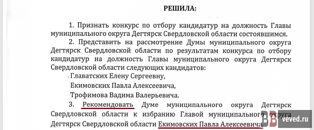 Однако в итоге из 15 депутатов думы Дегтярска Екимовских поддержали лишь 6, а победил с 8 голосами Вадим Трофимов, сообщило информагентство Ura.ru.