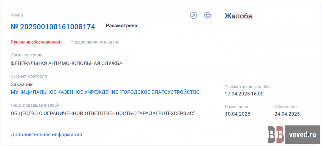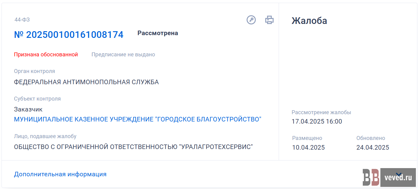 Антимонопольная служба в результате рассмотрения пришла к выводу, что требованиям законодательства не соответствует позиция екатеринбургского МКУ «Городское благоустройство», а жалоба «Уралагротехсервиса» признана обоснованной. Вчера заказчиком с уфимской фирмой всё-таки был заключён контракт, следует из информации на сайте госзакупок. А самому заказчику — МКУ «Городское благоустройство» — теперь грозит протокол об административном правонарушении.