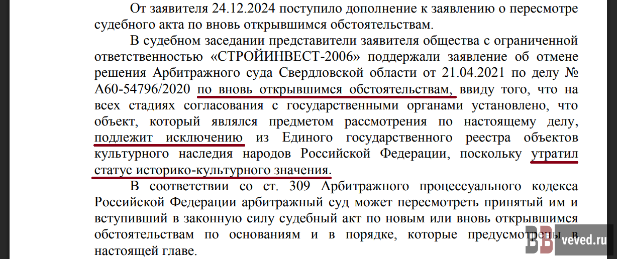 Примечательно, что исключение из реестра ОКН произошло на фоне длительного судебного процесса, продолжающегося с 2020 года — по иску Свердлохранкультуры, МУГИСО и лично министра культуры области Светланы Учайкиной арбитражный суд Свердловской области ещё в апреле 2021 году обязал собственника здания, ООО «Стройинвест-2006» провести противоаварийные работы, консервацию и затем реставрацию здания-памятника. Решение устояло в апелляционном, кассационном и Верховном суде. Однако в 2025 году производство по делу было возобновлено в связи с вновь открывшимися обстоятельствами (из-за процесса исключения из реестра ОКН), ближайшее заседание по делу назначено на 15 июля.