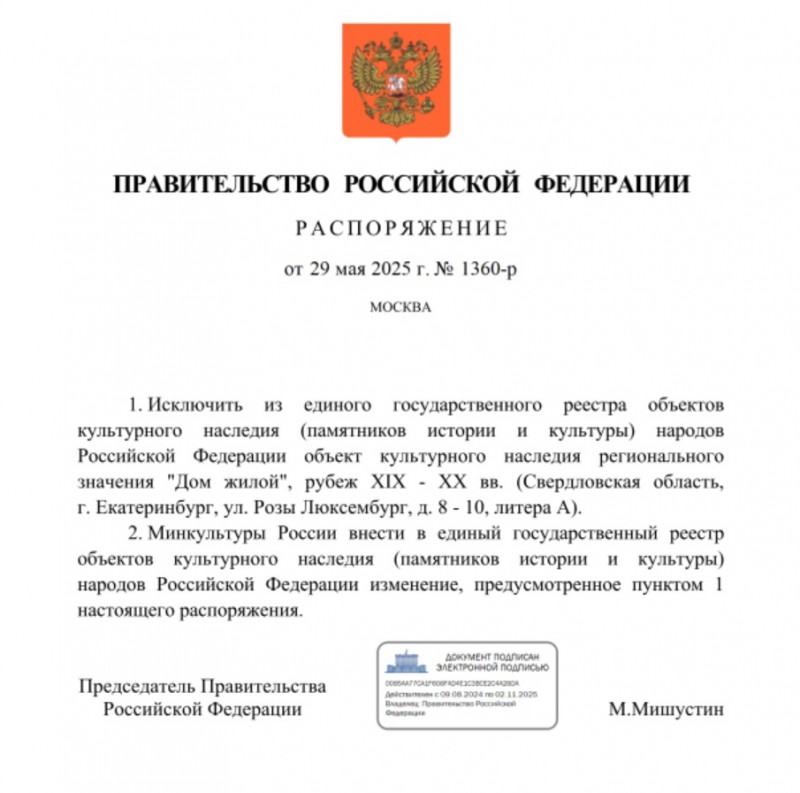 В Екатеринбурге здание, которое 16 лет назад частично обрушил экскаваторщик, исключили из реестра объектов культурного наследия. Сначала решение приняло правительство России на основании историко-культурной экспертизы, теперь соответствующие приказы опубликовало Управление госохраны объектов культурного наследия Свердловской области (Свердлохранкультура).