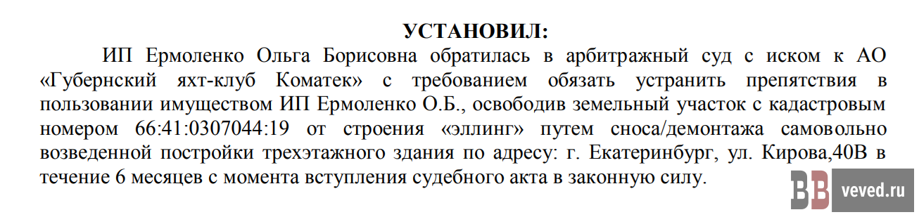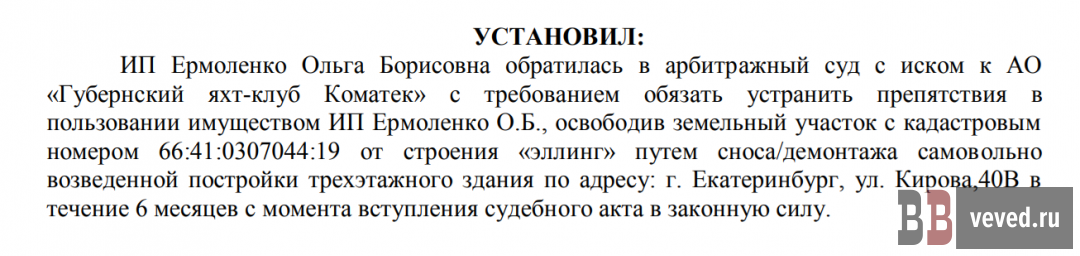 В одном из них индивидуальный предприниматель Ольга Ермоленко требует обязать устранить препятствия в пользовании имуществом ИП, освободив земельный участок с кадастровым номером 66:41:0307044:19 от строения «эллинг» путём сноса/демонтажа самовольно возведенной постройки трехэтажного здания по адресу: г. Екатеринбург, ул. Кирова,40В.