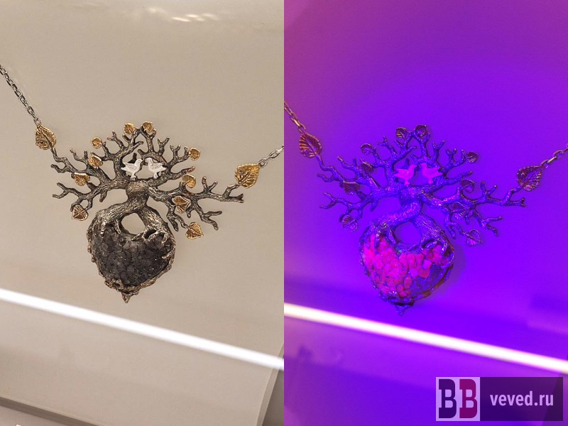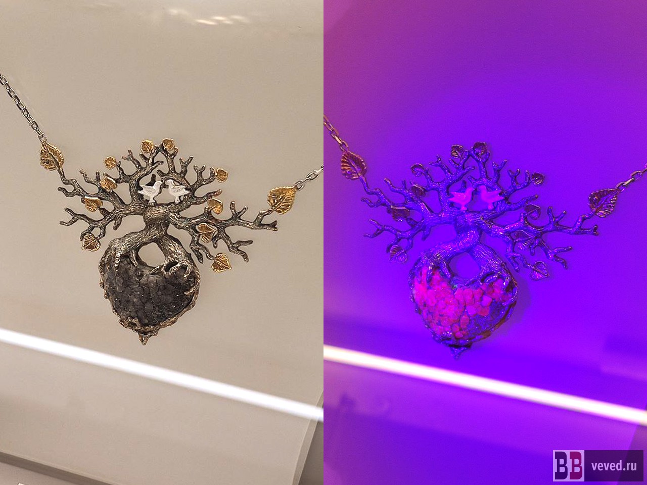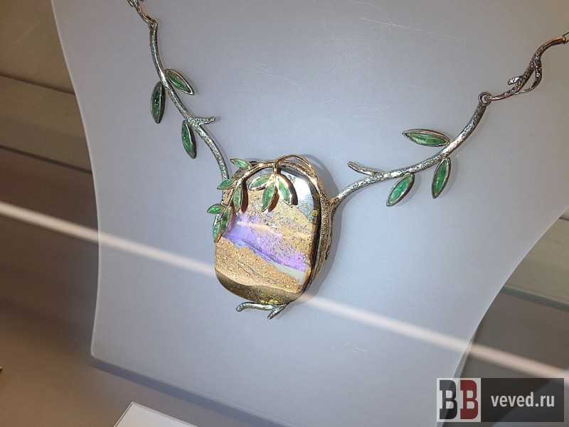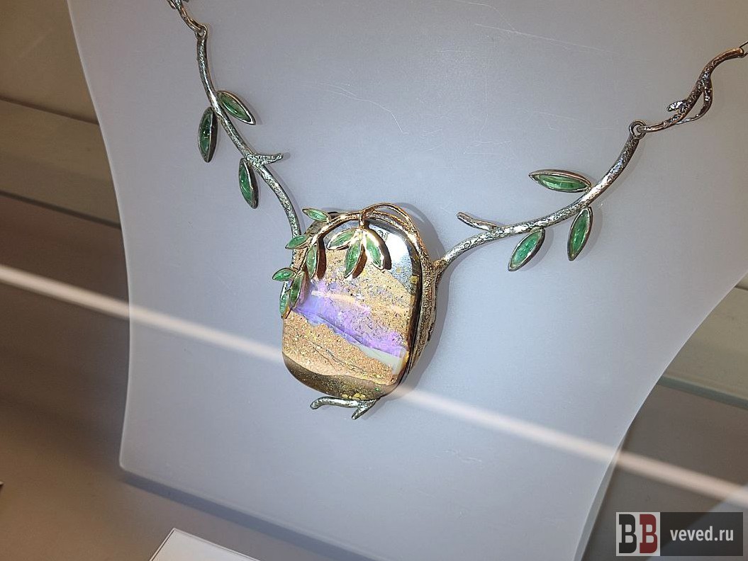 Первое колье в коллекции – «Гейзер», символизирующий бурное пробуждение жизни, рождение человека. Второе – «Река жизни» с миражами и лёгкой дымкой, с пустынным пейзажем и нежной влагой. По словам мастера, они много лет искали такой материал, чтобы река выглядела живой.