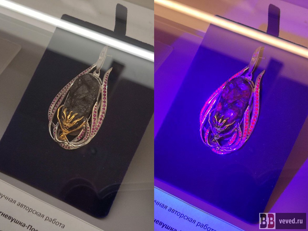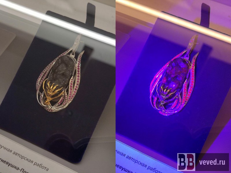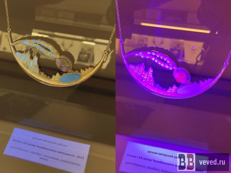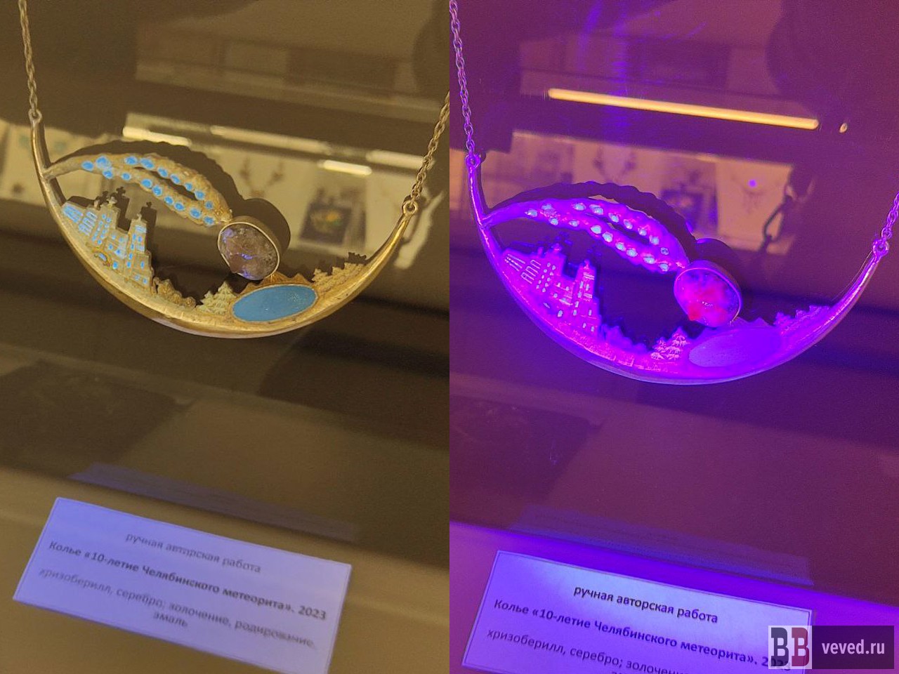 Также среди работ мастера одна посвящена челябинскому метеориту, который упал в 2013 году. Его вырезали спустя десять лет. Он, как и «Огневушка-Поскакушка», «загорается» под ультрафиолетом.