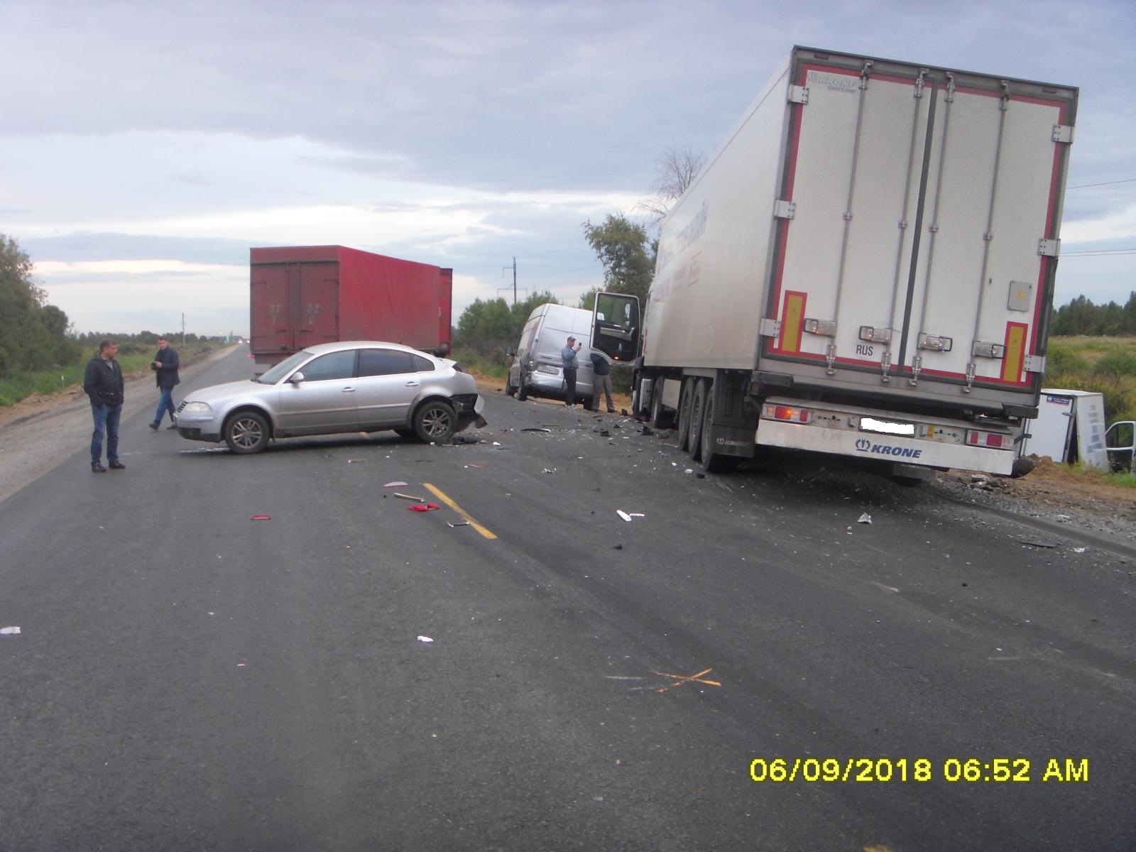В Юргамышском районе Курганской области столкнулись три грузовика и легковой автомобиль. Авария произошла ранним утром 6 сентября на автодороге М-51 «Байкал».