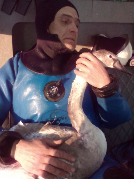 Лебедю угрожала реальная опасность, он мог замерзнуть или погибнуть от голода. Один из спасателей, надев водолазный костюм, направился на поимку птицы. Ухватить испуганную, голодную и замерзающую птицу удалось не сразу. Лебедь из последних сил метался по льду замерзшего водоема, прятался в камышах, но все-таки дался своему спасителю в руки.
