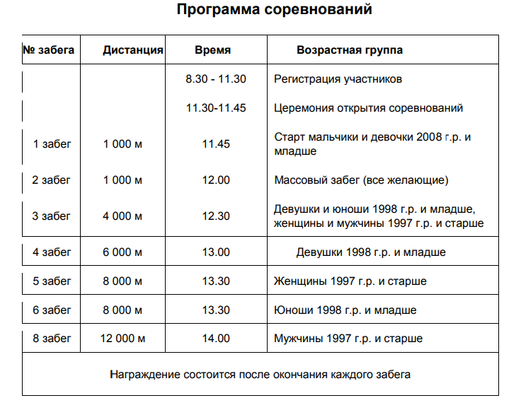 В ведомстве подчеркнули, что к соревнованиям на длинных дистанциях допустят только при наличии паспорта или свидетельства о рождении, допуска врача и полиса страхования жизни и здоровья от несчастных случаев. Но новичкам расстраиваться не стоит. Любой желающий без каких-либо ограничений сможет проверить свои возможности в массовом забеге на 1000 метров.